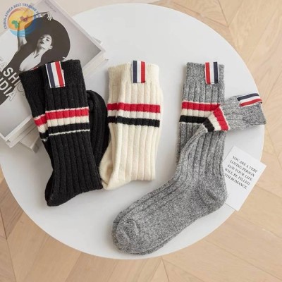秋冬日系粉色标签纯色原胚棉粗线针织中筒袜子