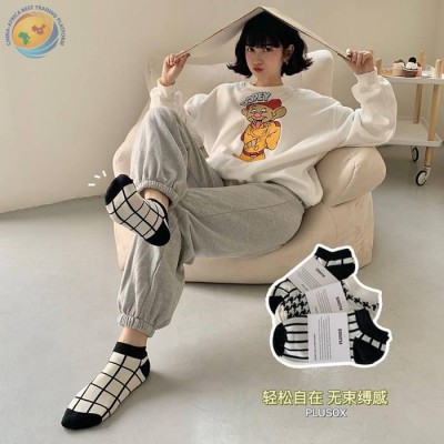 PLUSOX 夏季袜子男女低帮ins潮流黑白色条纹薄款日系潮透气情侣款