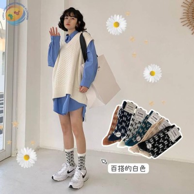 ins卷边蝴蝶结爱心女袜纯棉黑白灰中筒袜薄