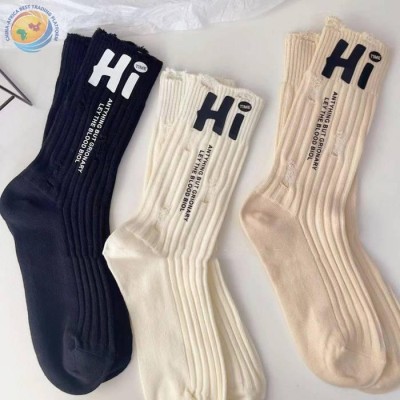 欧货新款纯棉破洞袜个性Hi字母贴标中筒袜
