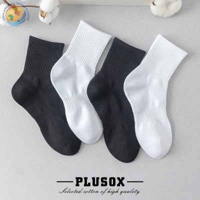 plusox袜子男中筒袜纯棉薄款毛巾底防臭吸汗纯色黑白夏季男士长袜