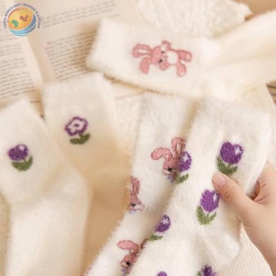 粉白小兔子水貂绒袜子女可爱甜美加厚保暖居家月子袜
