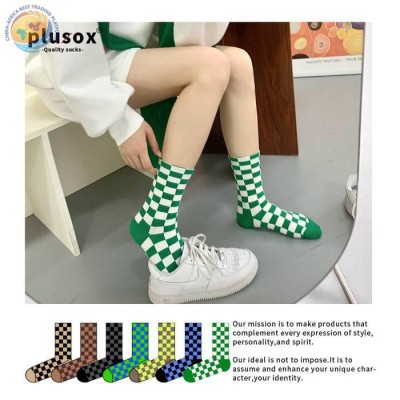 plusox 棋盘方格袜子女ins潮春秋中筒袜潮流街头滑板潮牌秋冬长袜