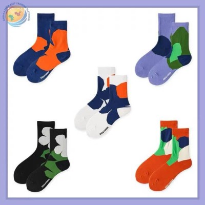韩国秋冬新款双针拼色布标袜纯棉中筒袜子