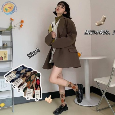 Plusox双针双路ins风复古格子袜子女秋冬新款堆堆袜女士日系 棉袜
