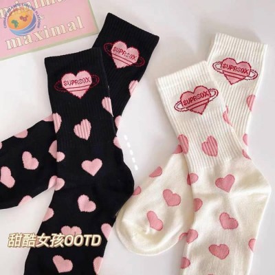 潮牌满身粉色爱心梦幻天使运动可爱男女甜美情侣黑白纯棉中筒袜子