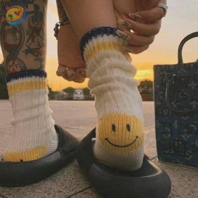 平田和宏毛线粗针笑脸脚跟厚款日系工装拼色条纹男女中筒袜子潮袜