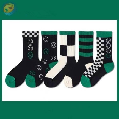 潮牌棋盘格袜子中筒笑脸黑绿色格子男女运动袜