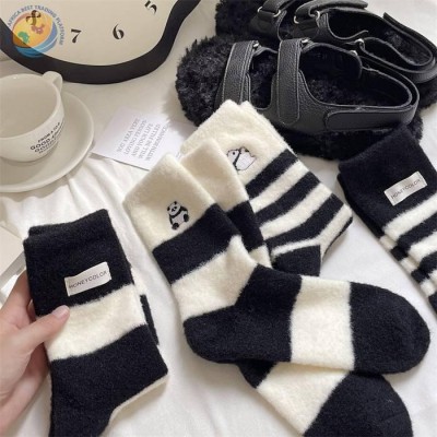 澳绒熊猫刺绣黑白条纹中筒袜黑白保暖月子袜