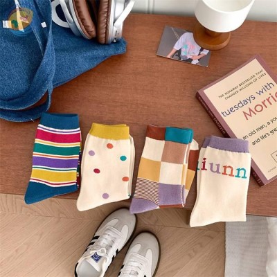 Niche color matching Retro brown autumn and winter mid-tube socks women's Japanese Polka dot color stripes contrast pure cotton socks