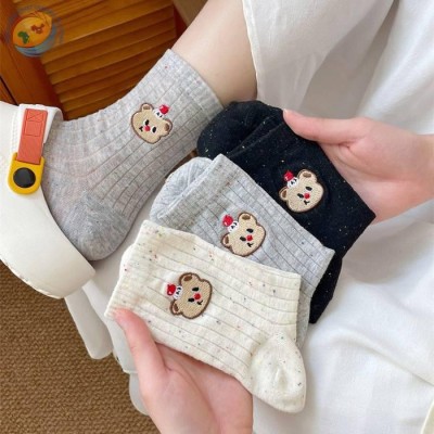 Dongdaemun cartoon Bear embroidery idea yarn socks female hollow thin vertical strip stockings personality trend socks