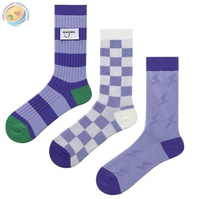 韩版紫色笑脸贴标中筒袜双针撞色条纹菱格复古潮流小众纯棉袜子女