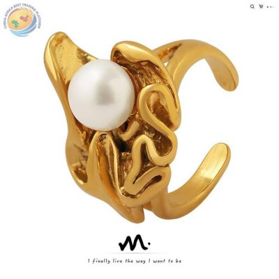 澳洲潮牌设计师时髦褶皱熔岩戒指钛钢镀金珍珠戒指