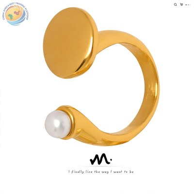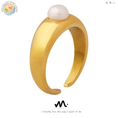 Titanium steel electroplated real gold inlaid with fresh water pearl open geometric ring everything