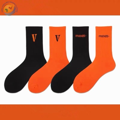 潮牌V字母黑橙韩版欧美街头嘻哈中长筒纯棉袜