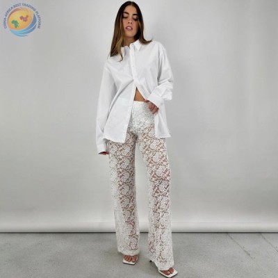 Fashion elegant solid color lace jacquard perspective loose pants pure hollow straight pants