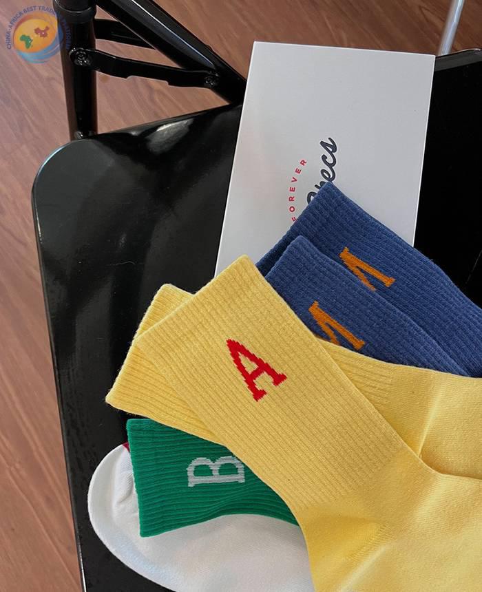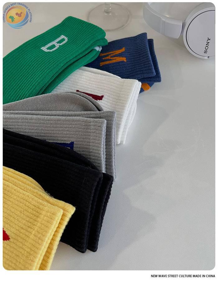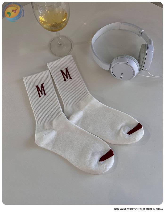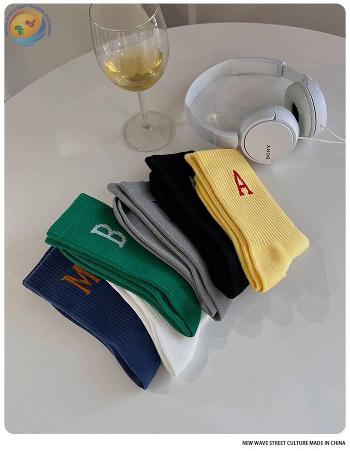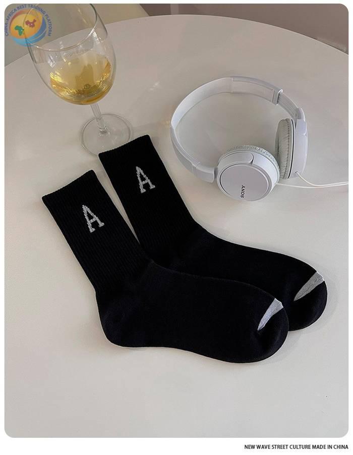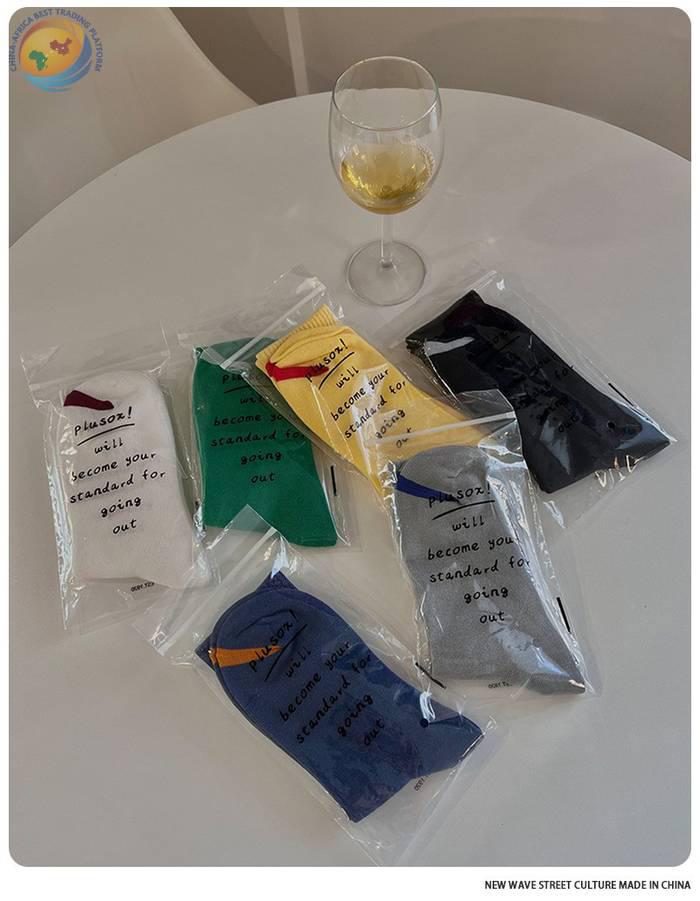 plusox日系高螺纹口中筒袜子ins女袜纯色字母棉袜四季运动情侣袜