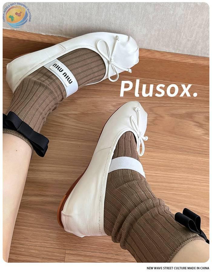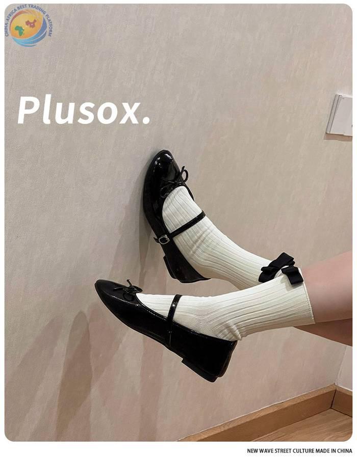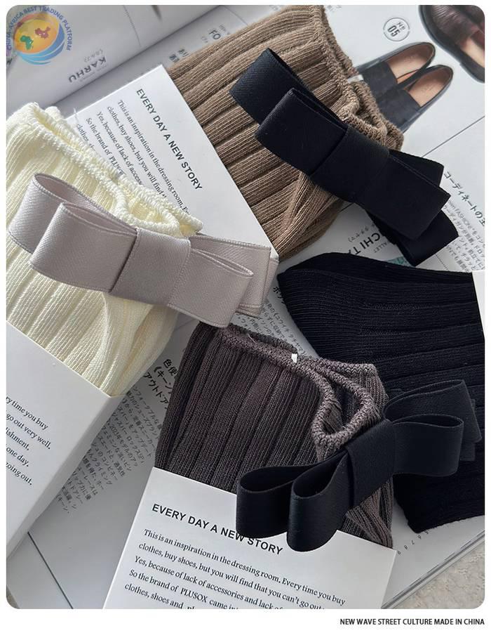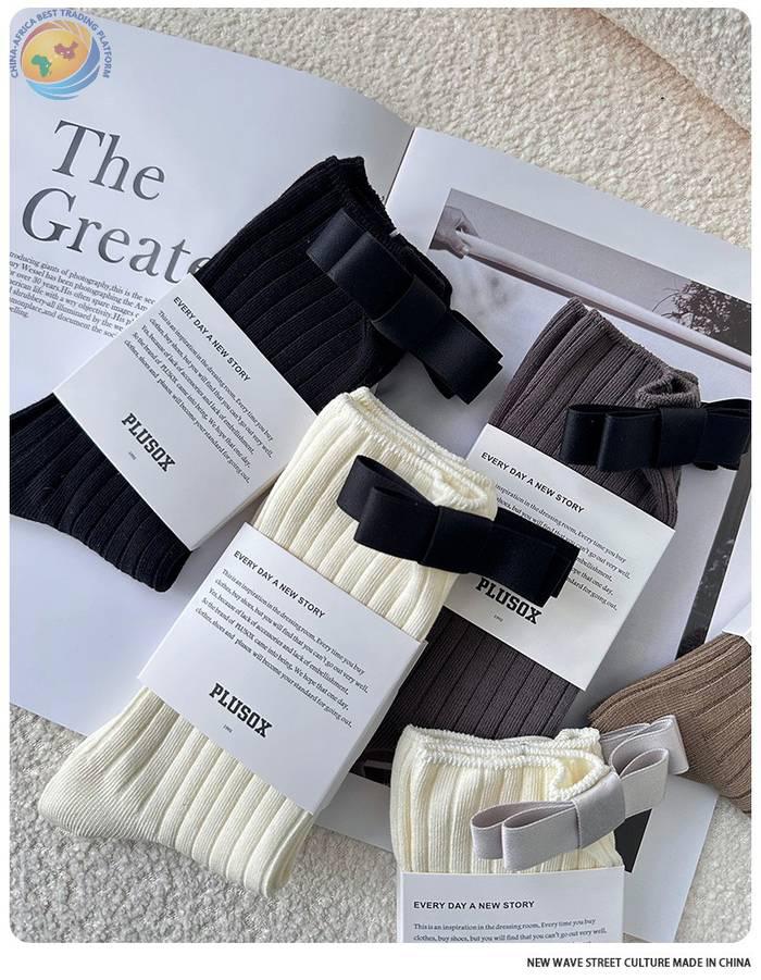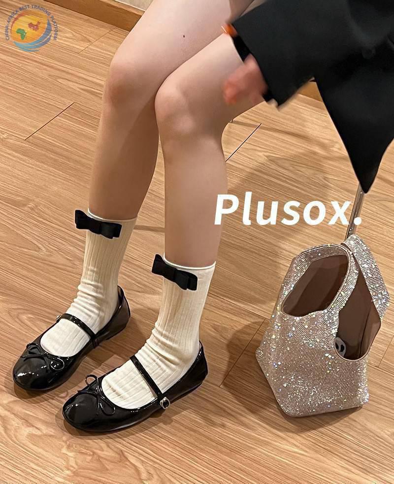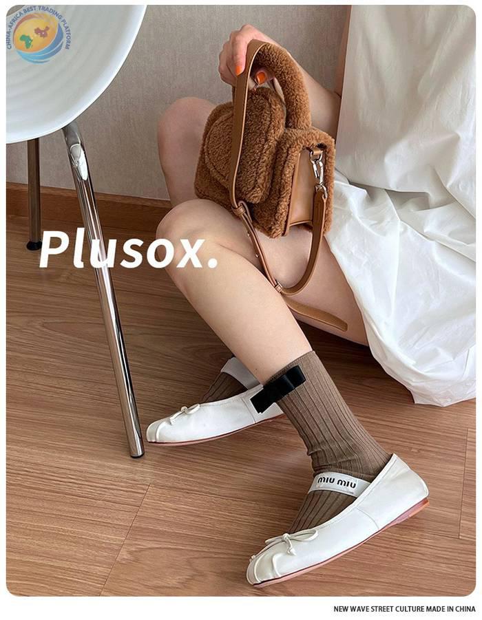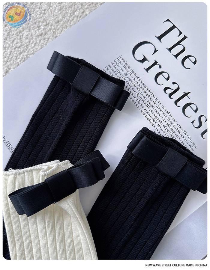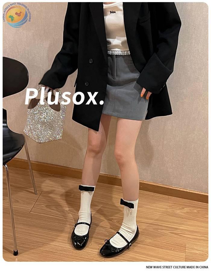 plusox春夏经典百搭少女蝴蝶结中筒袜针织miu风韩国小众堆堆袜女