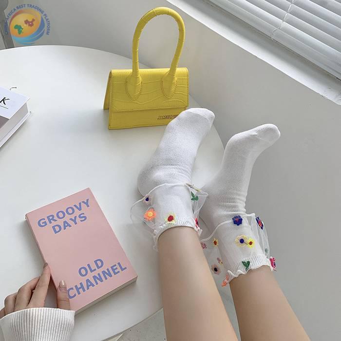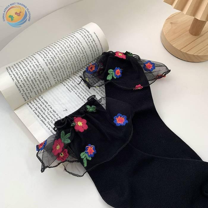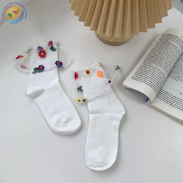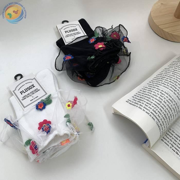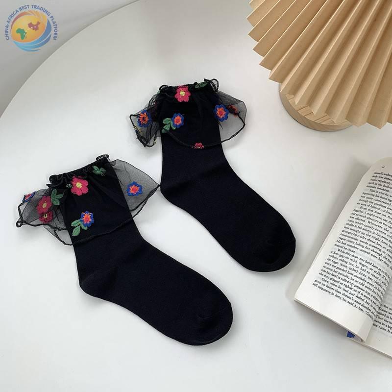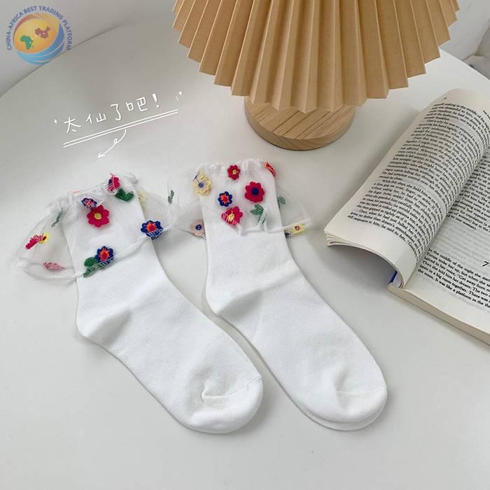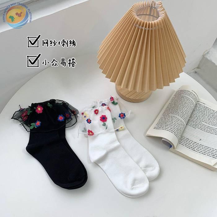 plusox 秋冬中筒袜女士韩版ins潮流百搭秋天少女蕾丝花边碎花袜子