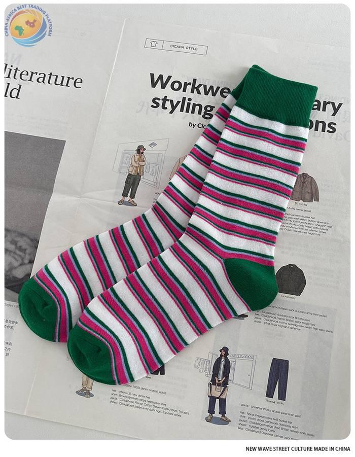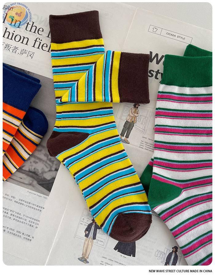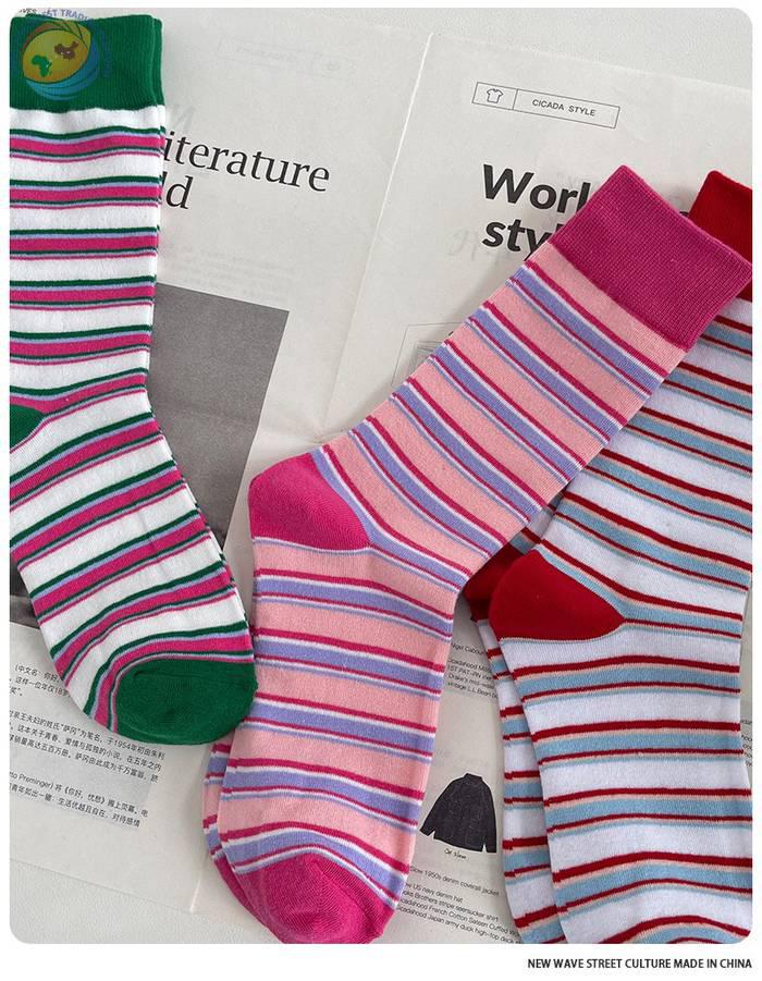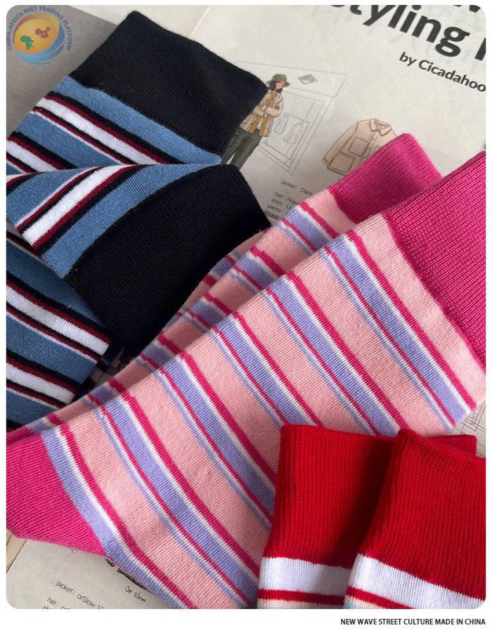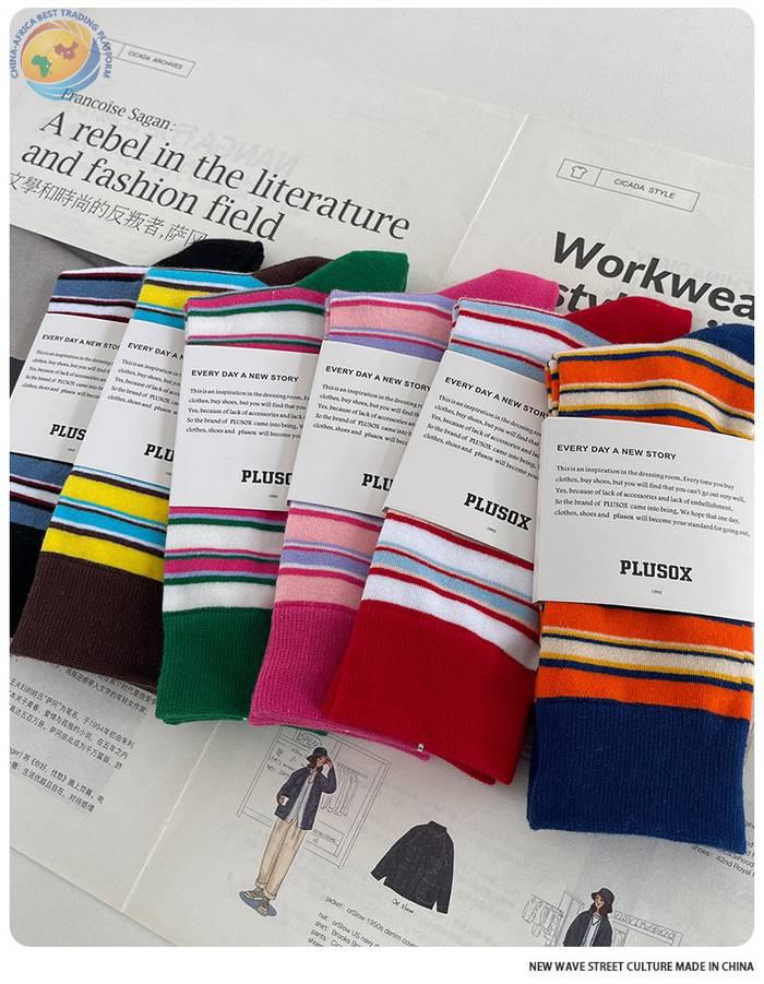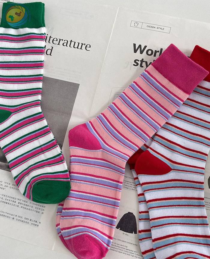plusox秋冬季韩国条纹袜子女中筒袜ins潮学生简约百搭长筒堆堆袜