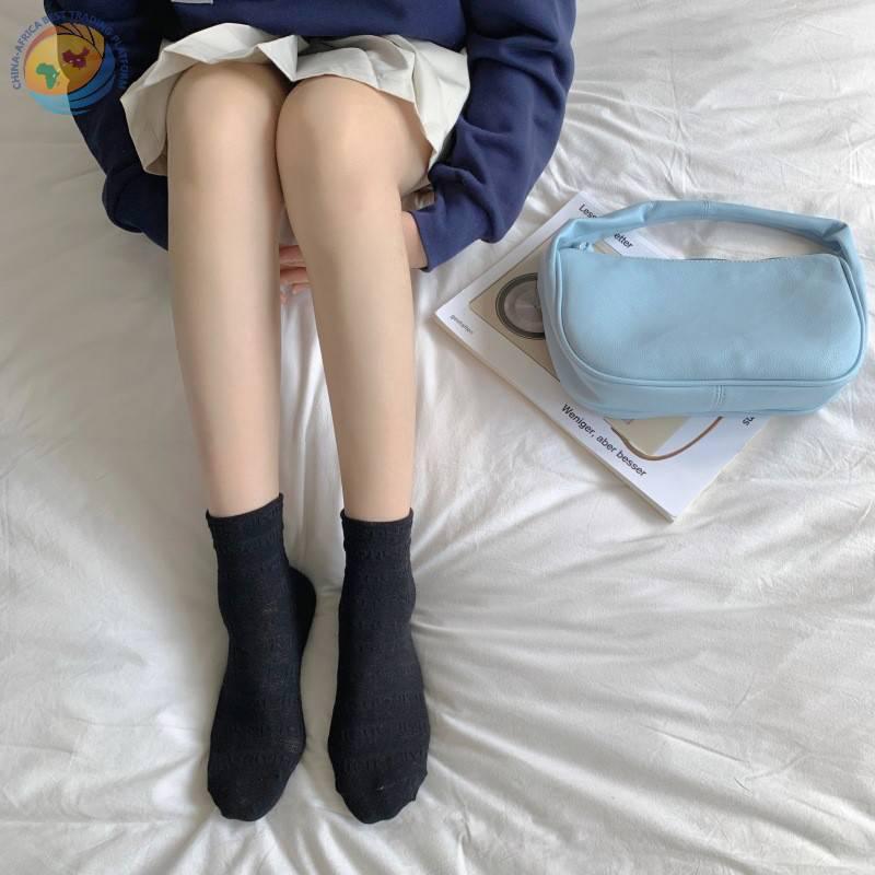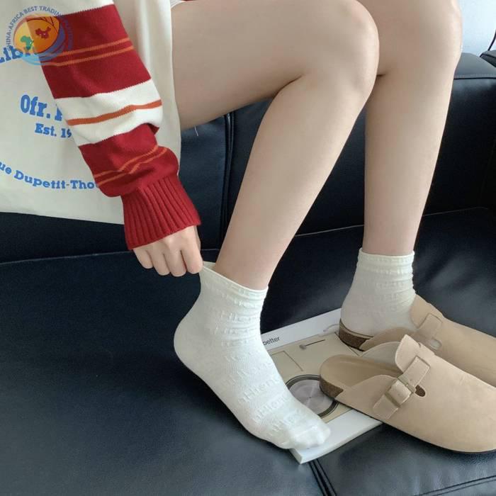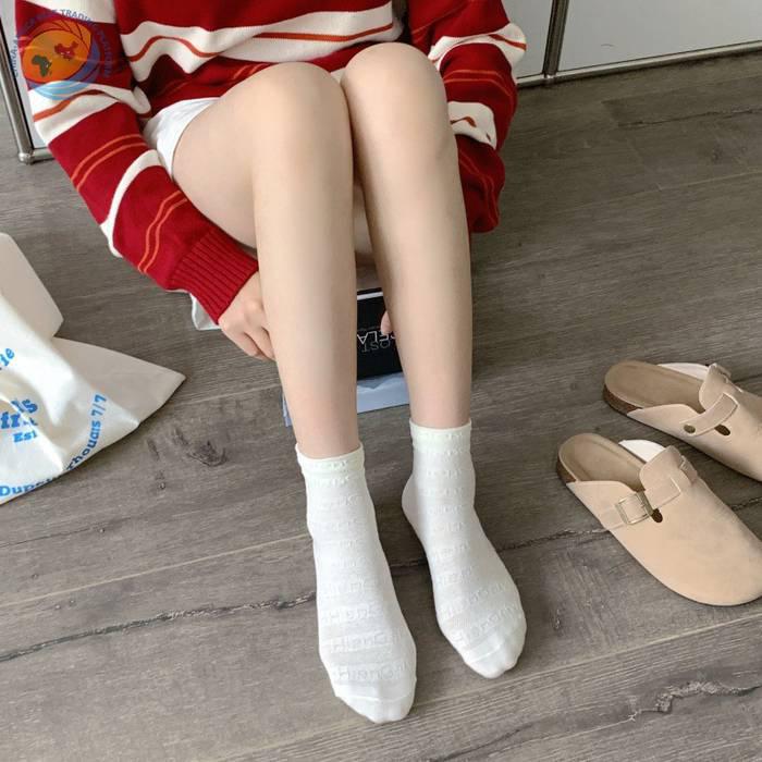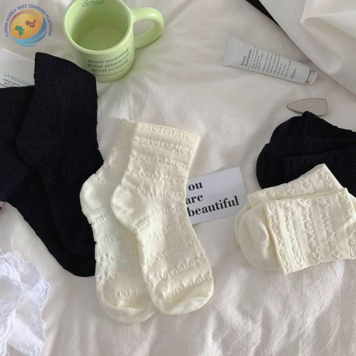 韩国新款黑白英文字母浮雕凹凸感女袜纯棉中筒袜