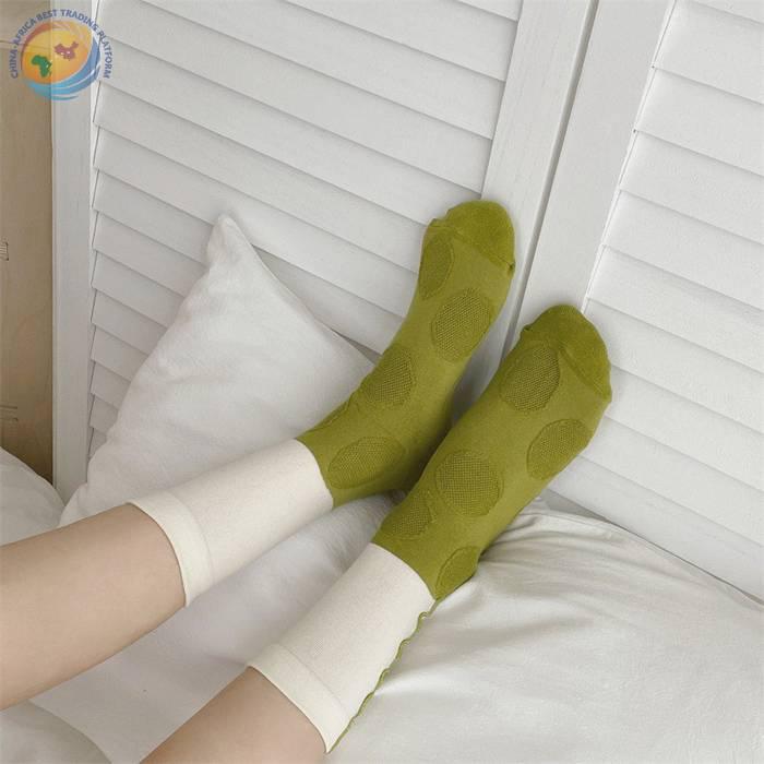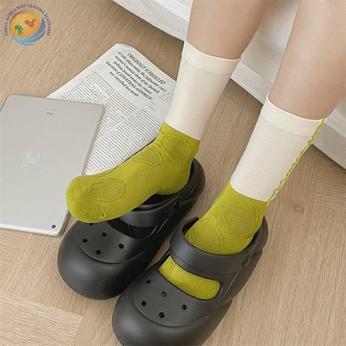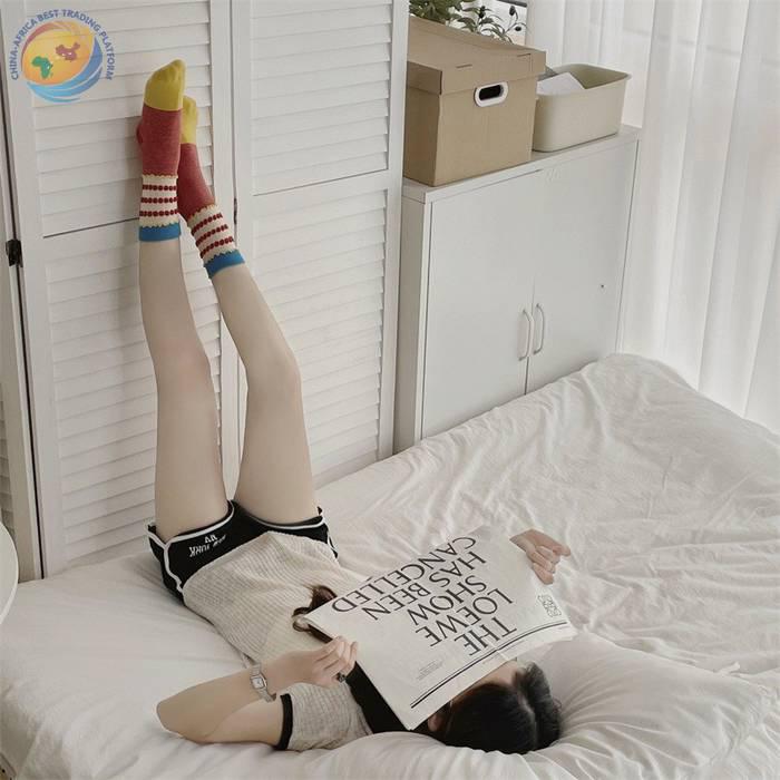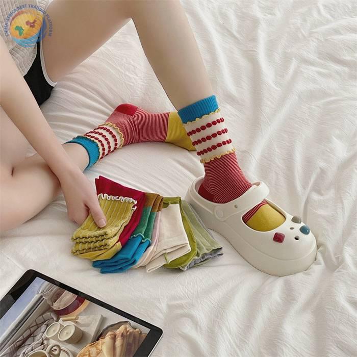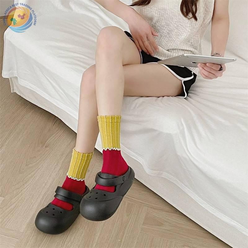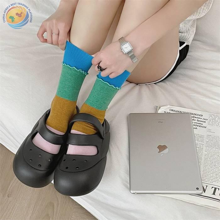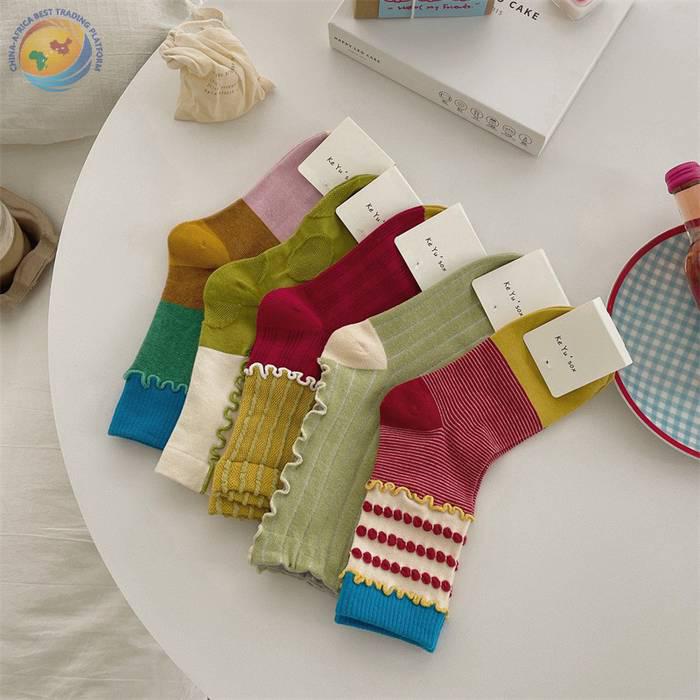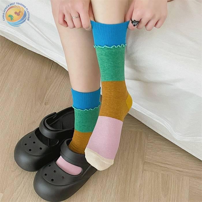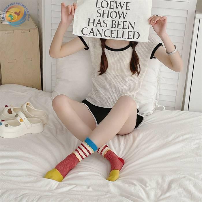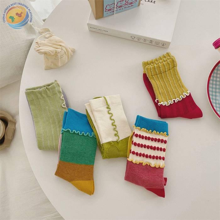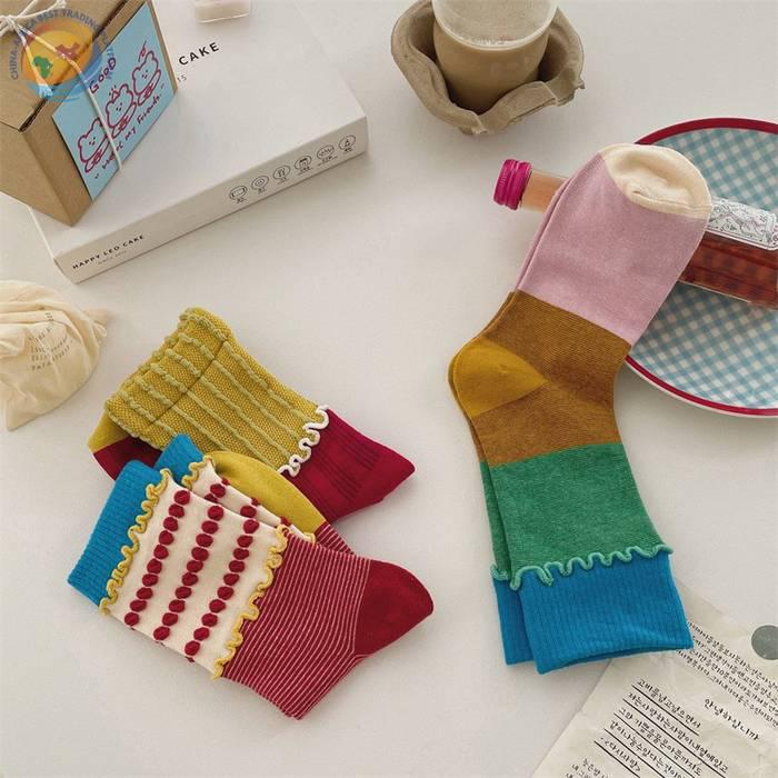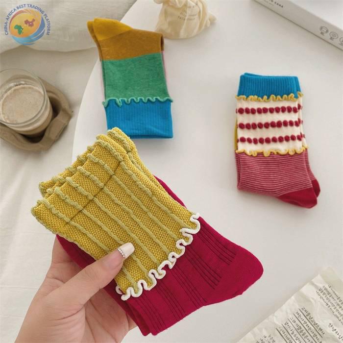 ins波浪边棉袜女撞色彩色条纹袜子女秋冬新款立体潮流撞色中筒袜