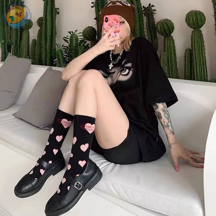 潮牌满身粉色爱心梦幻天使运动可爱男女甜美情侣黑白纯棉中筒袜子