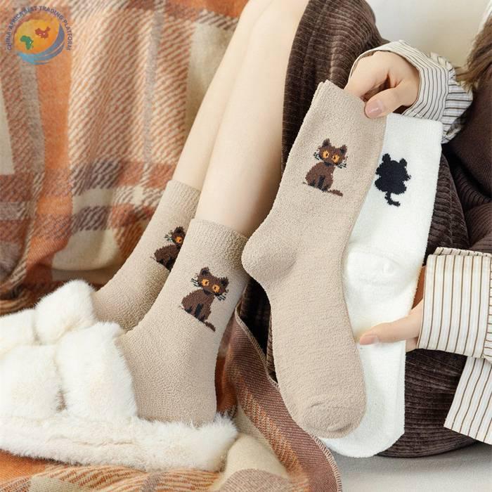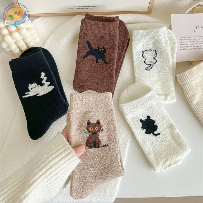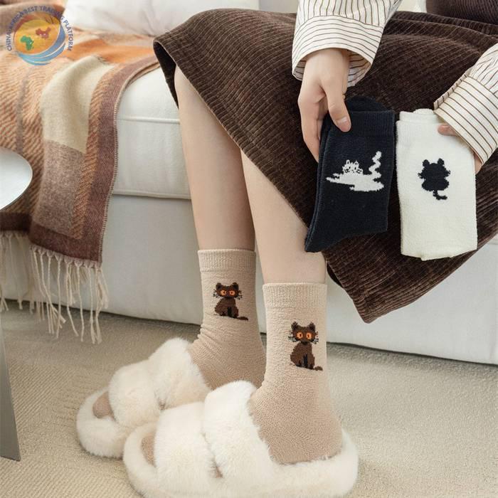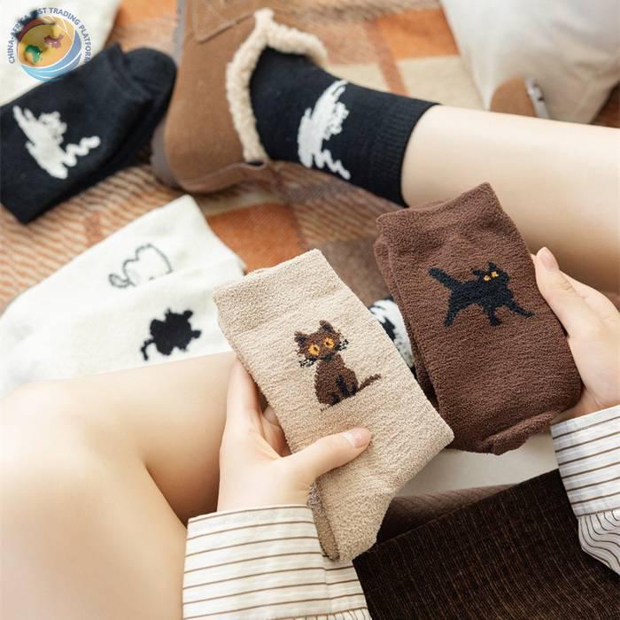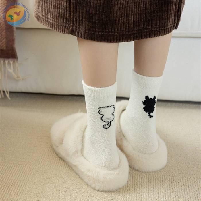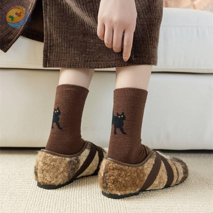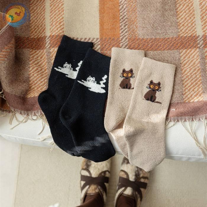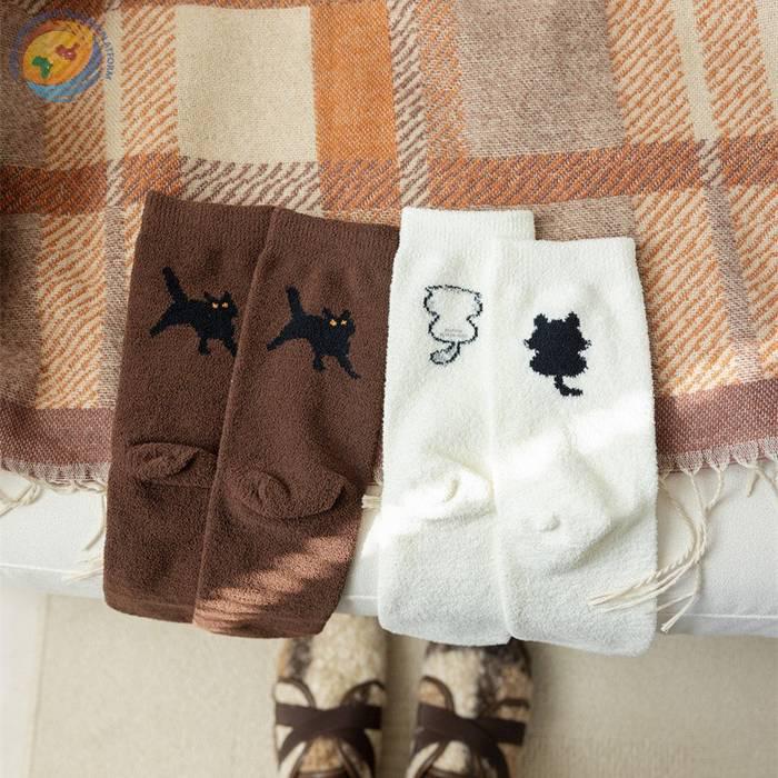 毛绒绒袜子女秋冬加厚加绒保暖卡通AB猫咪中筒袜