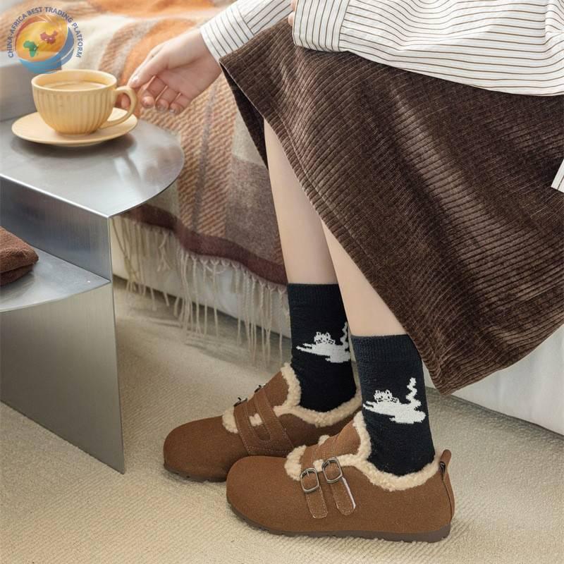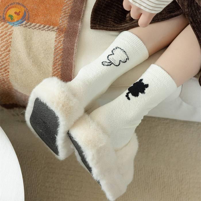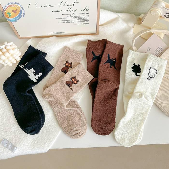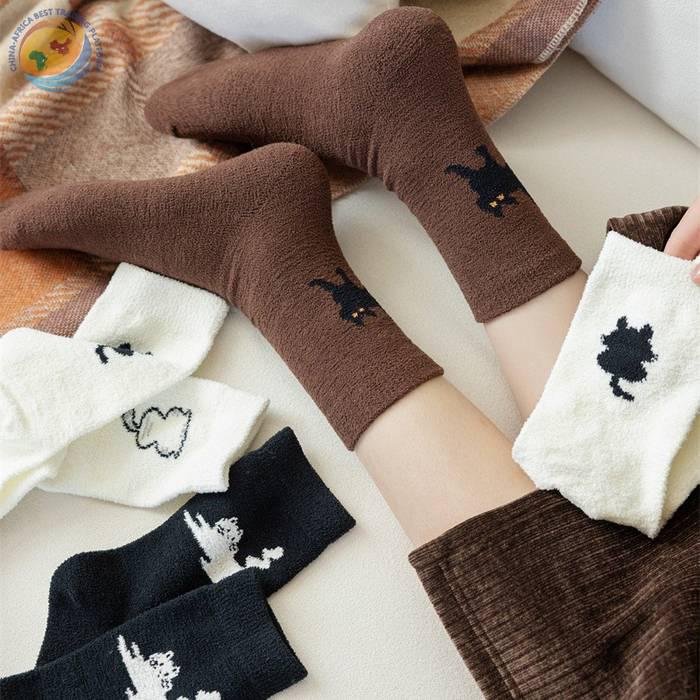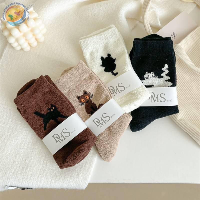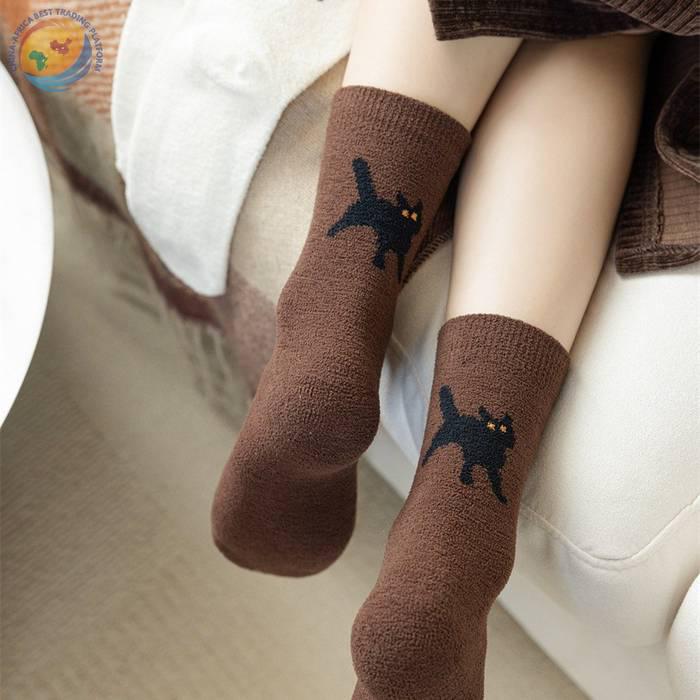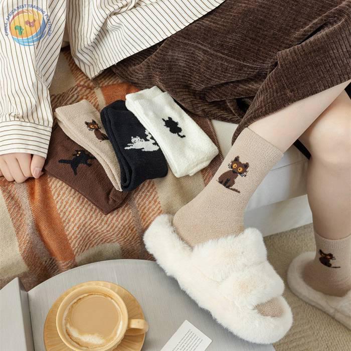毛绒绒袜子女秋冬加厚加绒保暖卡通AB猫咪中筒袜