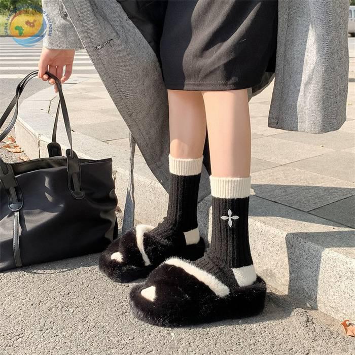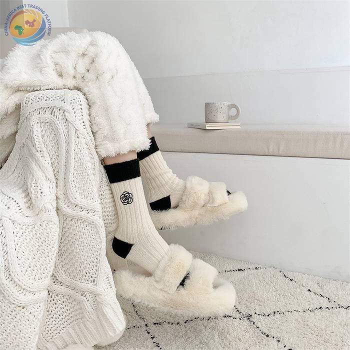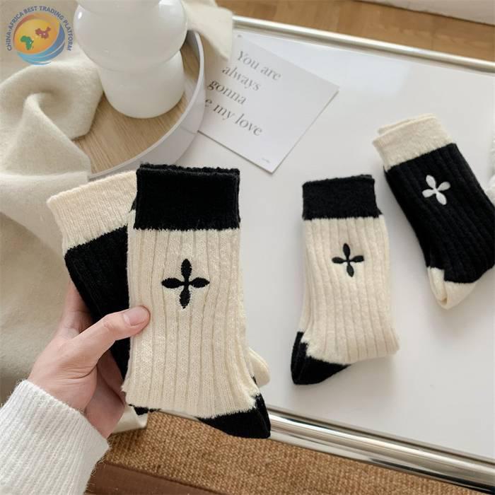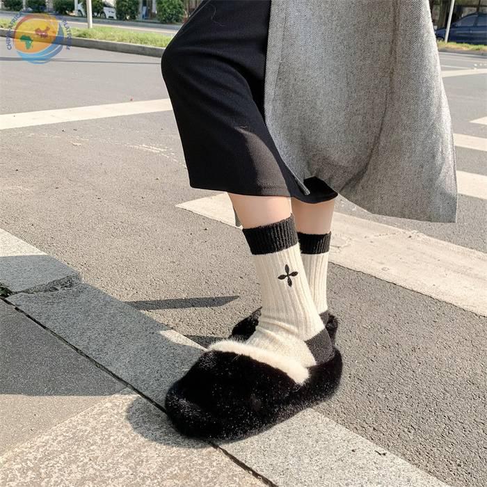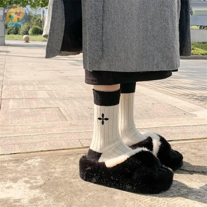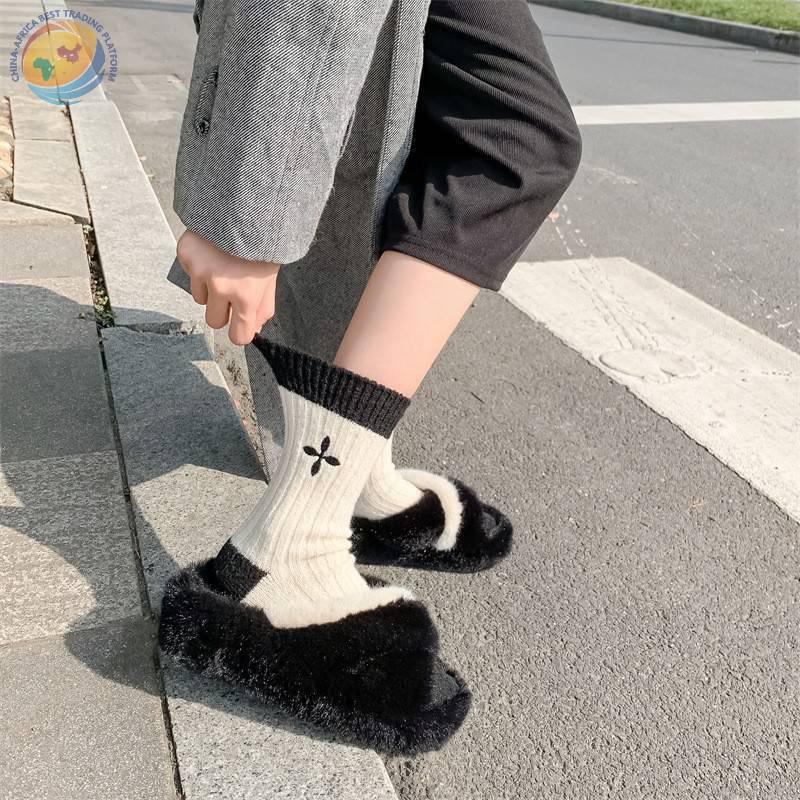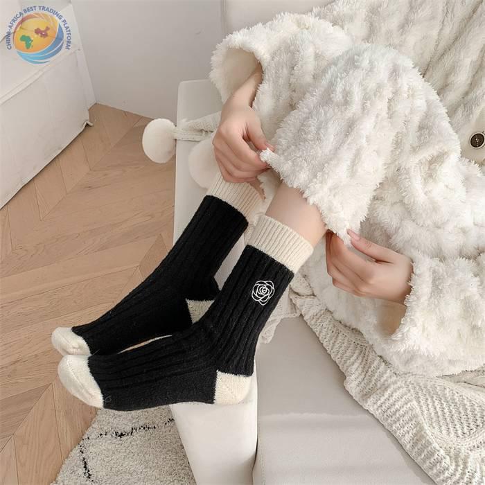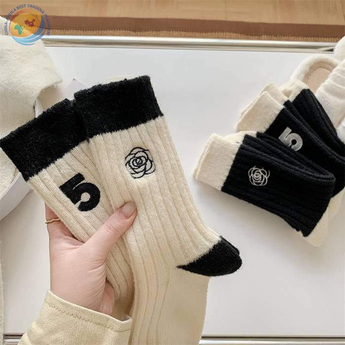 日系十字架玫瑰花刺绣羊毛袜子女中筒袜