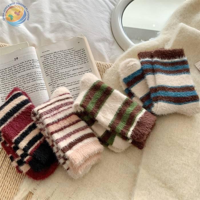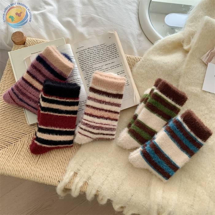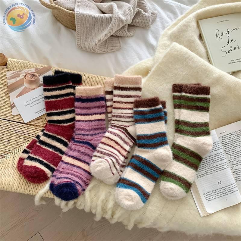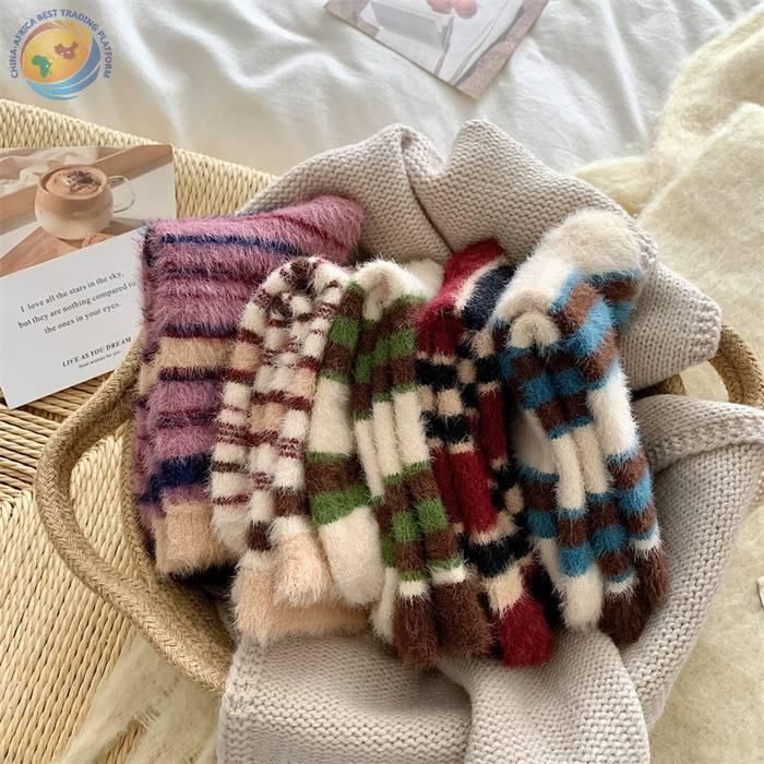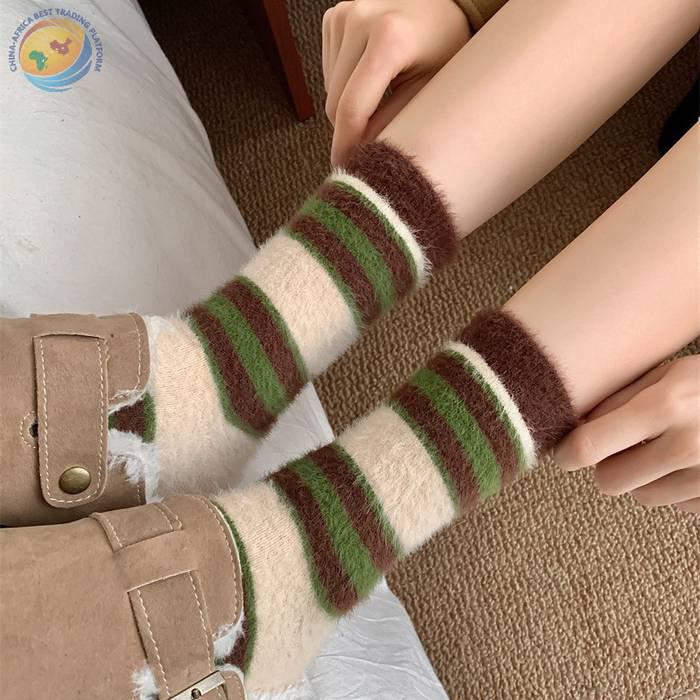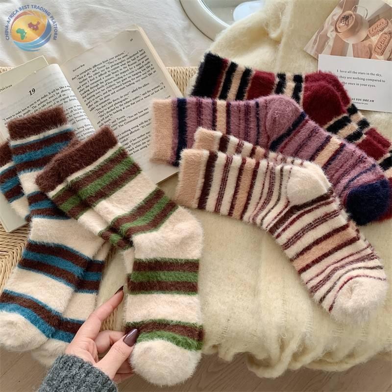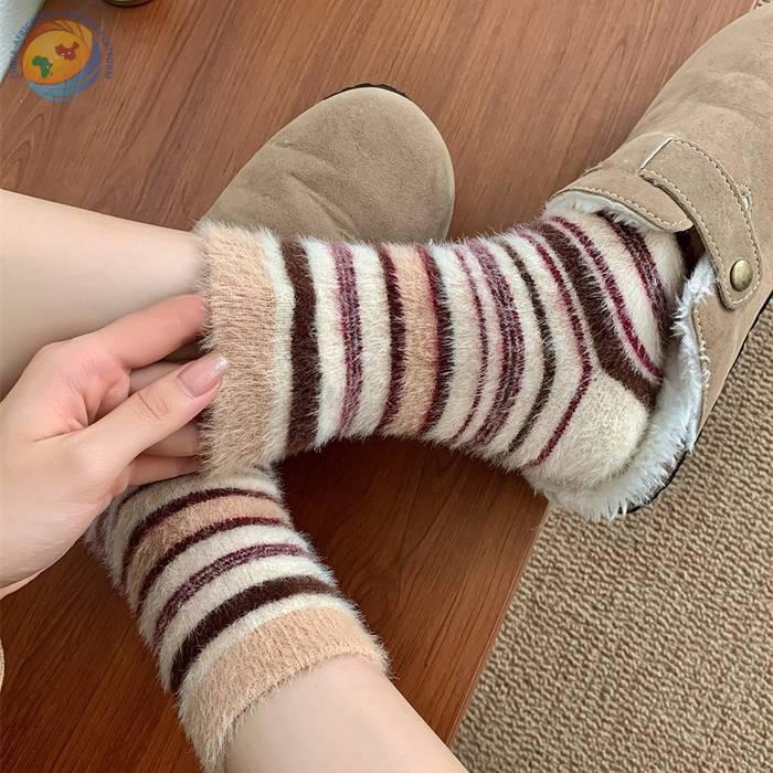 秋冬保暖毛绒袜子水貂绒复古拼色条纹少女中筒袜