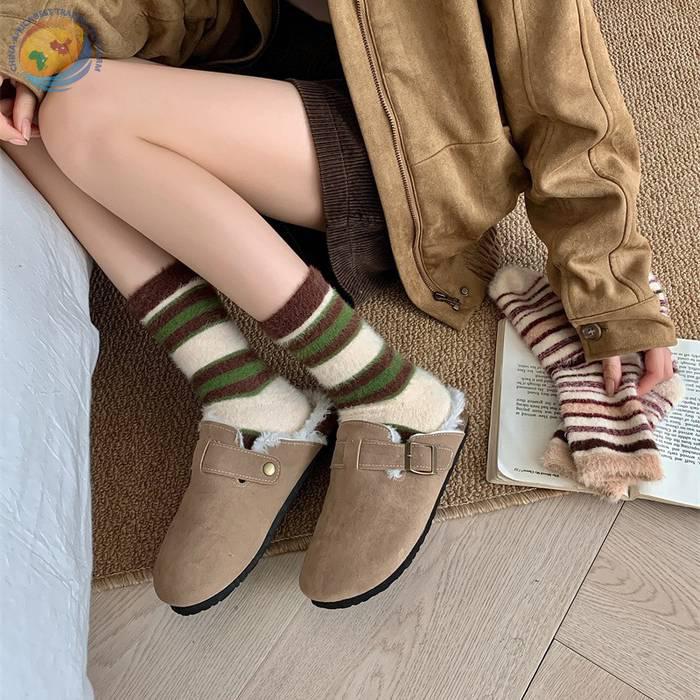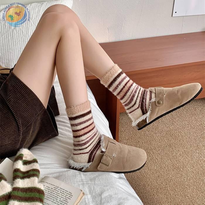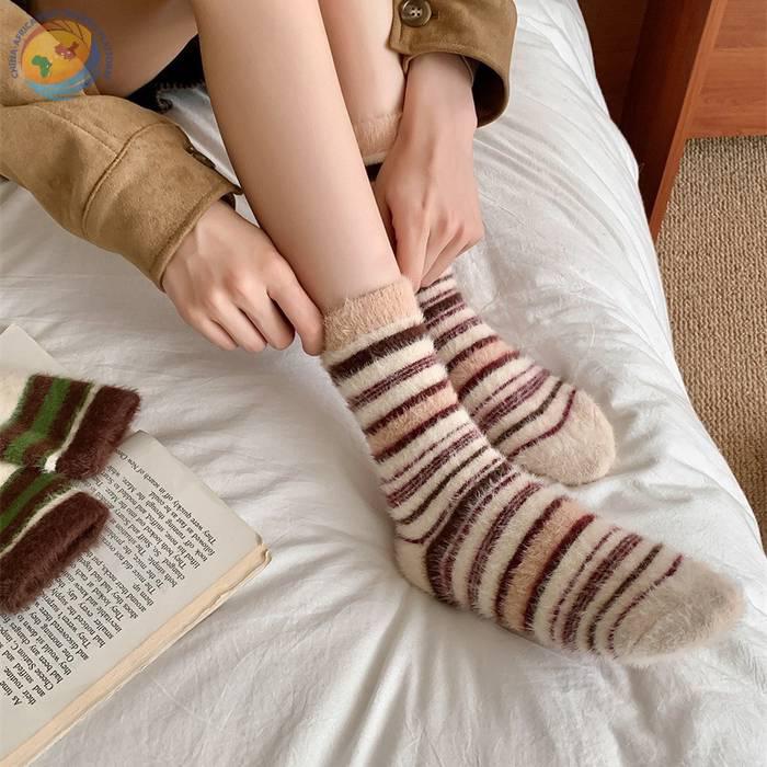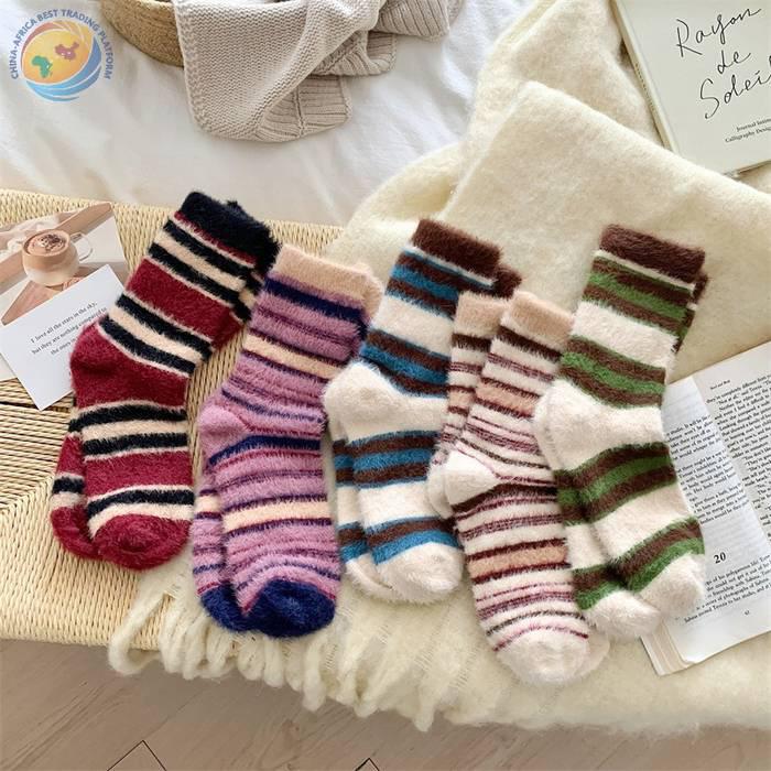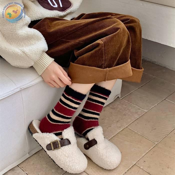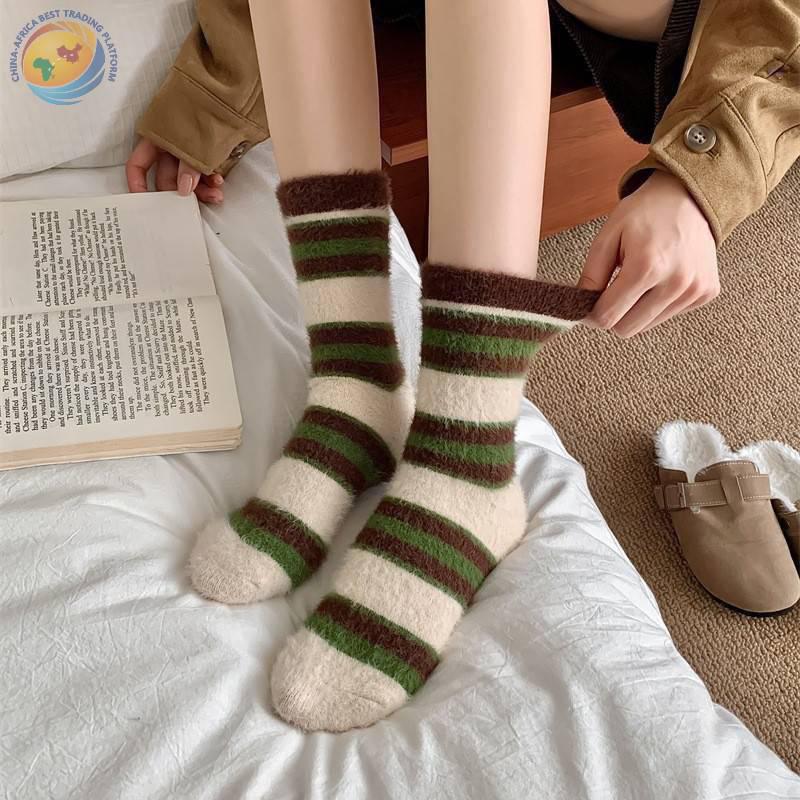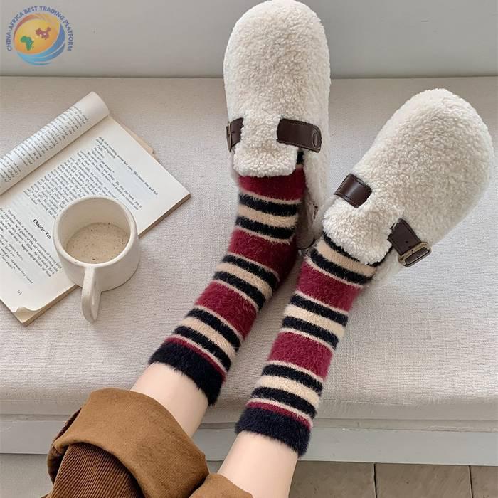 秋冬保暖毛绒袜子水貂绒复古拼色条纹少女中筒袜